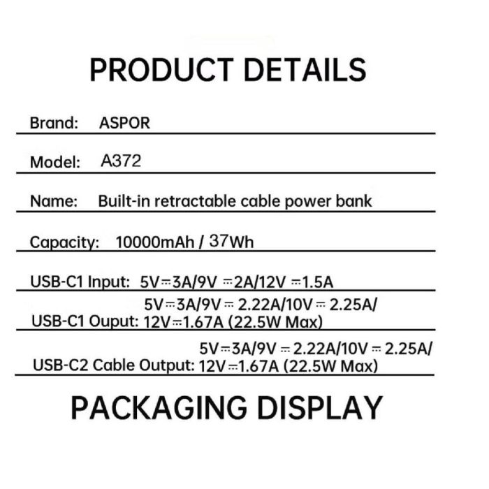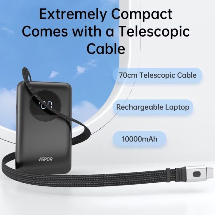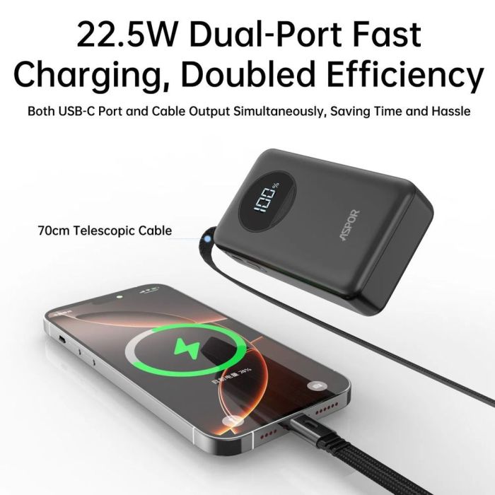 - بطارية احتياطية 10000 مل أمبير بقوة 22.5 واط مع كيبل USB-C مدمج قابل للسحب من Aspor