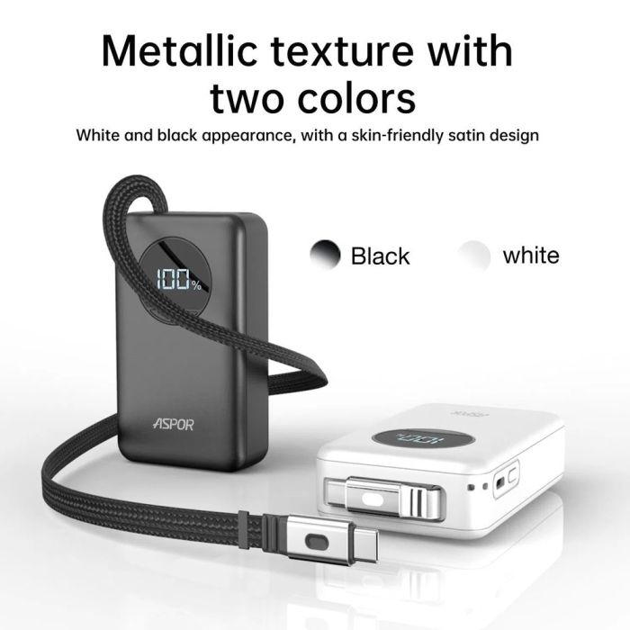 بطارية احتياطية 10000 مل أمبير بقوة 22.5 واط مع كيبل USB-C مدمج قابل للسحب من Aspor