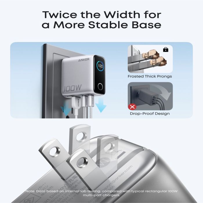 شاشة ذكية تعرض القوة والجهد ودرجة الحرارة لحظة بلحظة، ومنفذا USB-C يصل كل منهما لـ 100 واط بأداء مستمر يفوق الشواحن العادية. تصميم مدمج أصغر بـ 30% مع قابس قابل للطي يناسب الحقيبة والجيب، ونظام ActiveShield 4.0 يراقب الحرارة أكثر من مليون مرة يومياً لحماية أجهزتك في كل وقت.