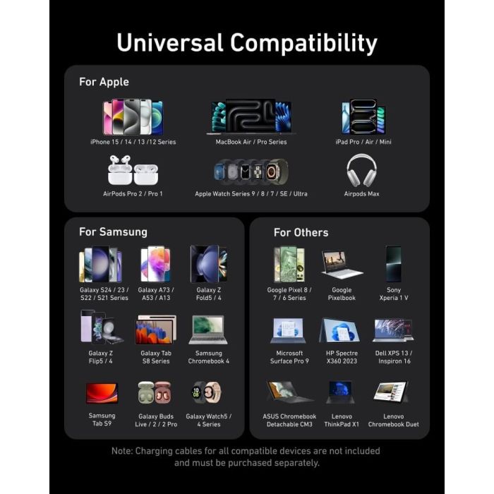 - يدعم شحن ثلاثة أجهزة في نفس الوقت مع توزيع ذكي للطاقة