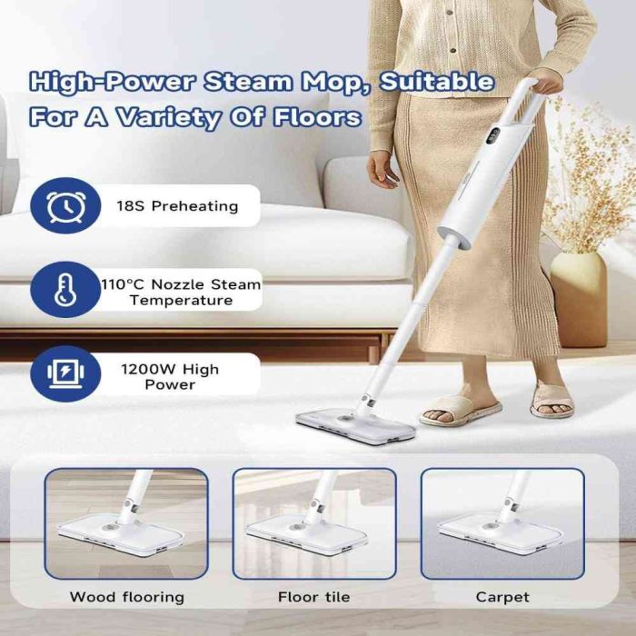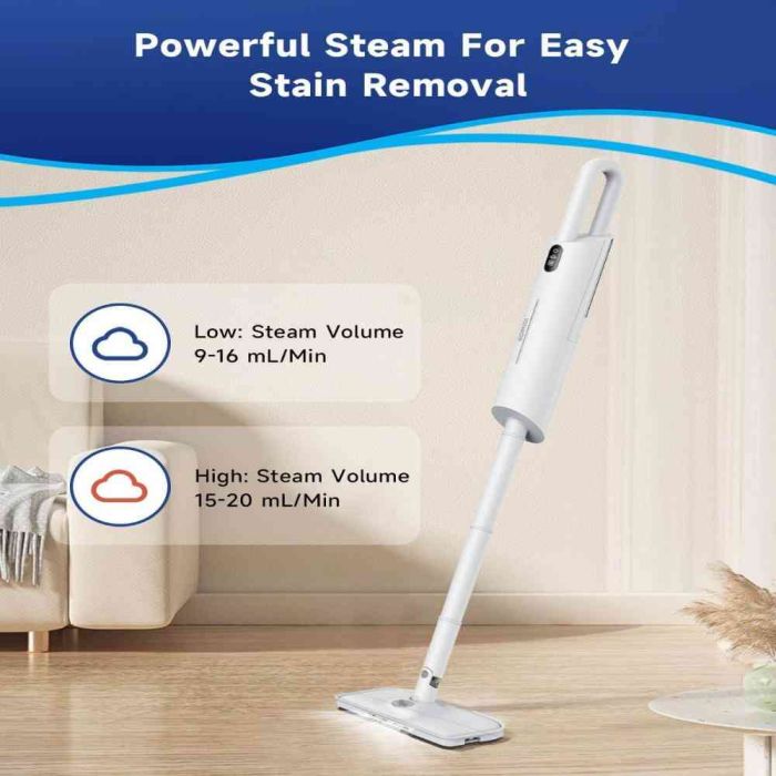 تنظيف عميق وفعال مع ممسحة البخار الذكية بقوة 1200 واط، المصممة لإزالة البقع الصعبة وقتل البكتيريا بالبخار الساخن. بفضل خزان المياه بسعة 380 مل مع مستوى مرئي، يمكنك إعادة التعبئة بسهولة في أي وقت. يوفر نظام التحكم الذكي باللمس تجربة استخدام سلسة مع عرض درجة حرارة البخار في الوقت الفعلي. تسخين سريع في 18 ثانية يتيح لك البدء فورًا، بينما تتيح أوضاع البخار المزدوجة إزالة البقع بلطف أو التعامل مع الأوساخ العنيدة بكفاءة. تصميم خفيف الوزن يمكن حمله يدويًا أو ارتداؤه على الظهر لتقليل إجهاد اليد. يمكن استخدامه على الأرضيات الخشبية، البلاط، والسجاد مع إمكانية إضافة معقمات لتعقيم المساحات وتحسين جودة الهواء