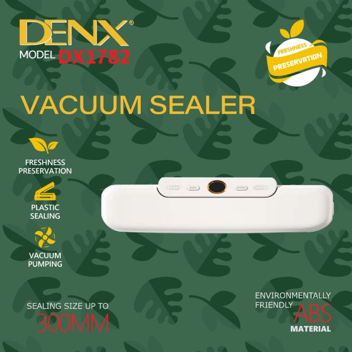 حافظ على طعامك طازجًا لأطول فترة ممكنة مع ماكينة الـ DENX DX1782، الحل الأمثل للحفاظ على نكهة وجودة الأطعمة. تتميز هذه الماكينة بقدرتها على إغلاق الأكياس حتى مقاس 300 ملم، مما يضمن لك تخزينًا آمنًا وفعالًا. تعمل بجهد كهربائي 220 فولت وقوة 120 واط، وتعمل بتردد 50 هرتز، مما يجعلها مناسبة للاستخدام في جميع المنازل.