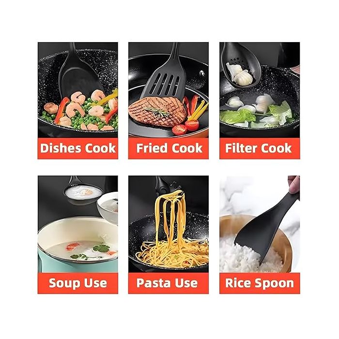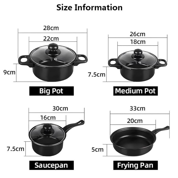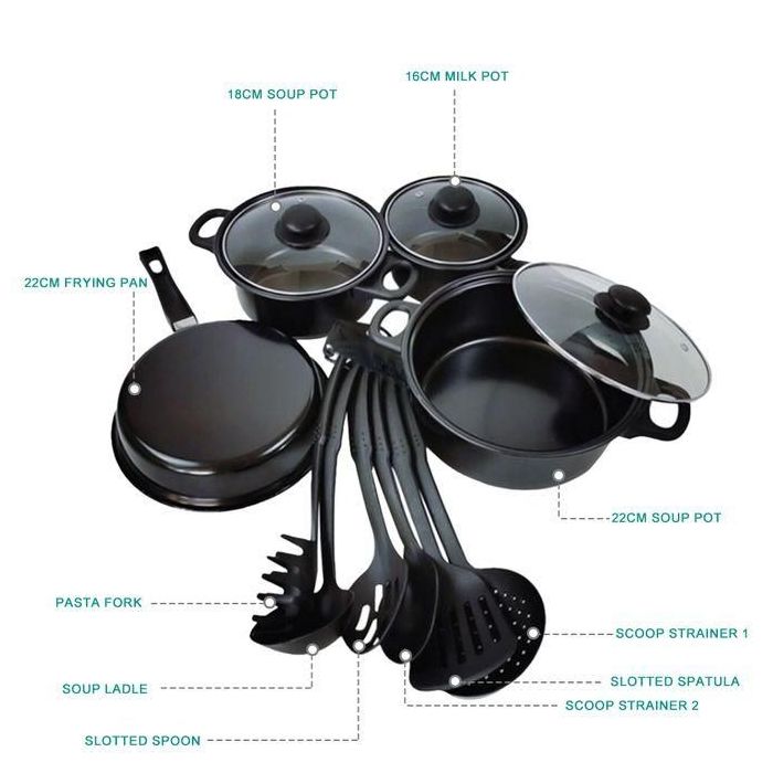 - يتضمن قدر للحليب، قدر للحساء، مقلاة، قدر لليخنة، 6 ملاعق، و3 أغطية