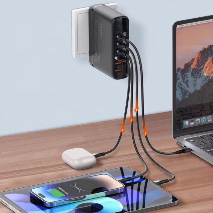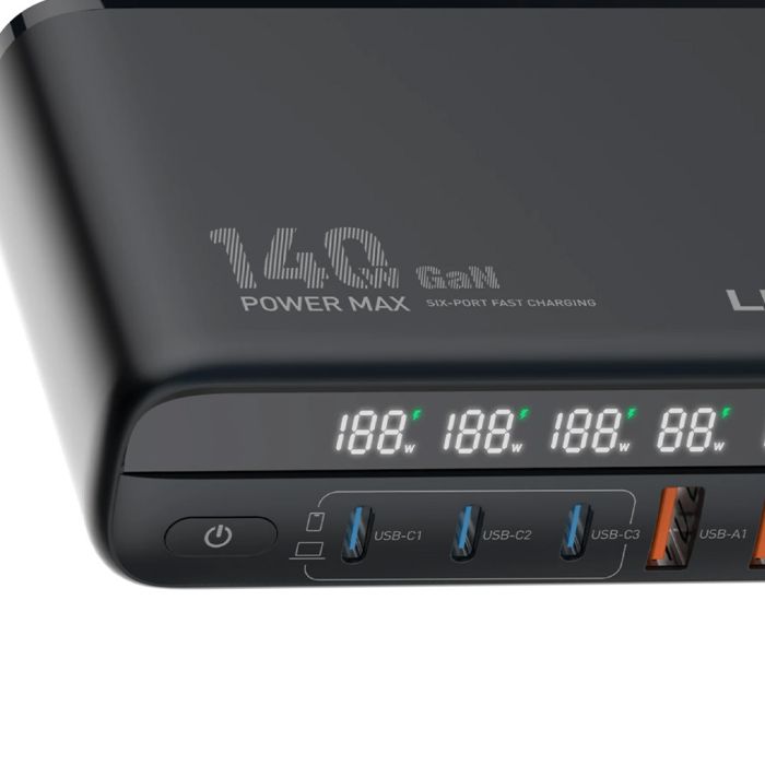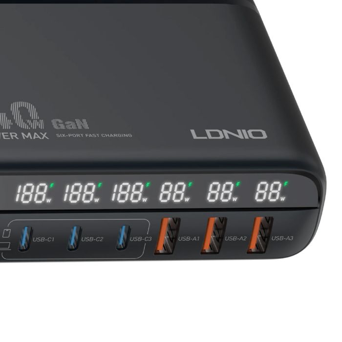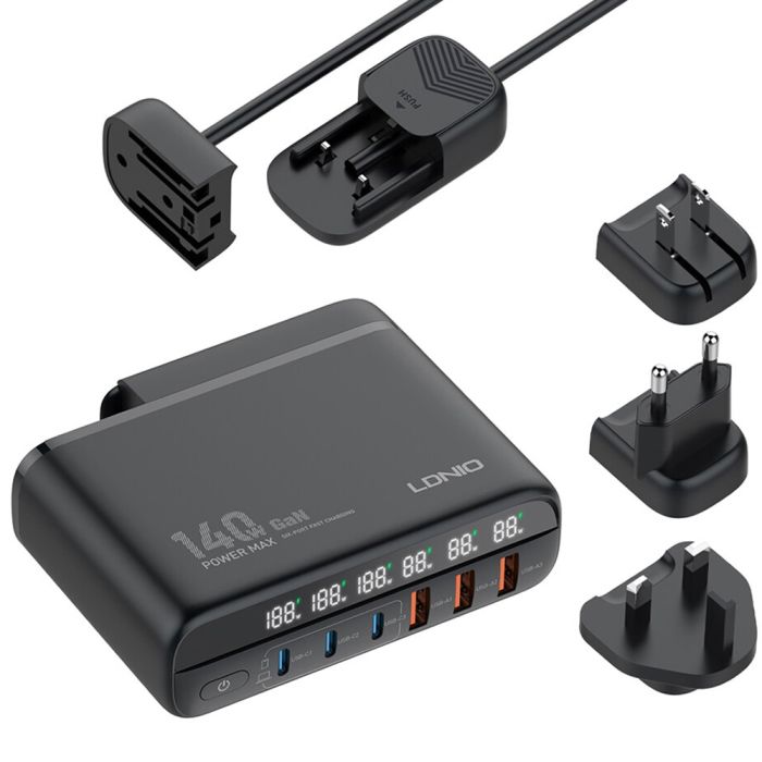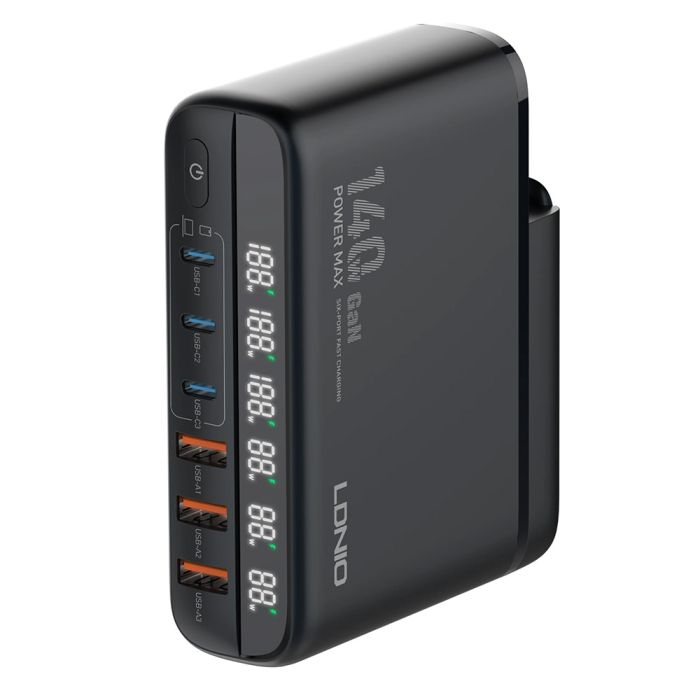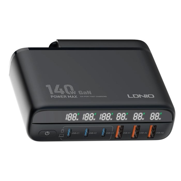 يمكن لشاحن سطح المكتب LDINO شحن ما يصل إلى ستة أجهزة في نفس الوقت باستخدام العديد من بروتوكولات الشحن السريع، وهذا ما يجعله متوافقاً مع مجموعة واسعة من الأجهزة، بما في ذلك الهواتف الذكية والتابلت واللابتوب وغيرها من الأجهزة الإلكترونية. يحتوي على 3 منافذ USB-C و3 منافذ USB-A، مما يوفر طاقة تصل إلى 140 واط. يتميز بتقنية GaN للشحن السريع، شاشة LED لكل منفذ و 9 مستويات متعددة للحماية