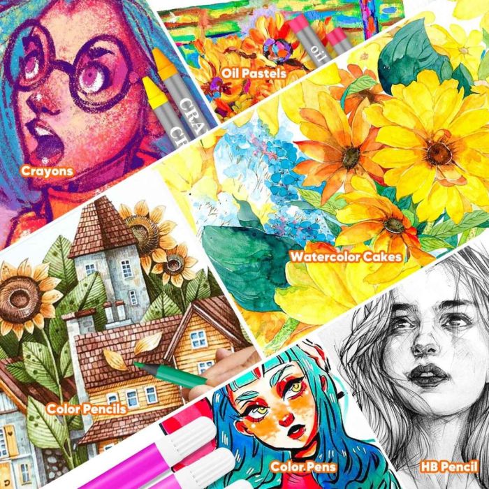 - مع مجموعة متنوعة من الألوان والوسائط للاختيار من بينها، تشجع مجموعة الفن هذه التعبير عن الذات وتسمح للفنانين المبتدئين بتجربة تقنيات وأنماط مختلفة. سواء كان طفلك يفضل الباستيل الزيتي أو أقلام التلوين أو أقلام الرصاص الملونة أو كعكات الألوان المائية، فإن مجموعة الفن هذه تحتوي على كل شيء، مما يسمح بإمكانيات فنية لا حصر لها والتعبير عن إبداعهم الفريد بحرية