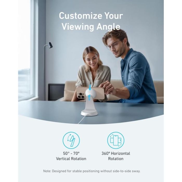 شاحن ذكي يدعم الشحن اللاسلكي فائق السرعة بقوة 15 واط، مع تصميم 2 في 1 لشحن iPhone وAirPods في وقت واحد، وزاوية عرض قابلة للتعديل بين 50 و70 درجة مع تدوير 360 درجة، تصميم أنيق وخفيف يشمل كيبل بطول 1.5 متر، ويعمل بكفاءة مع أجهزة iPhone من الجيل 12 حتى 16