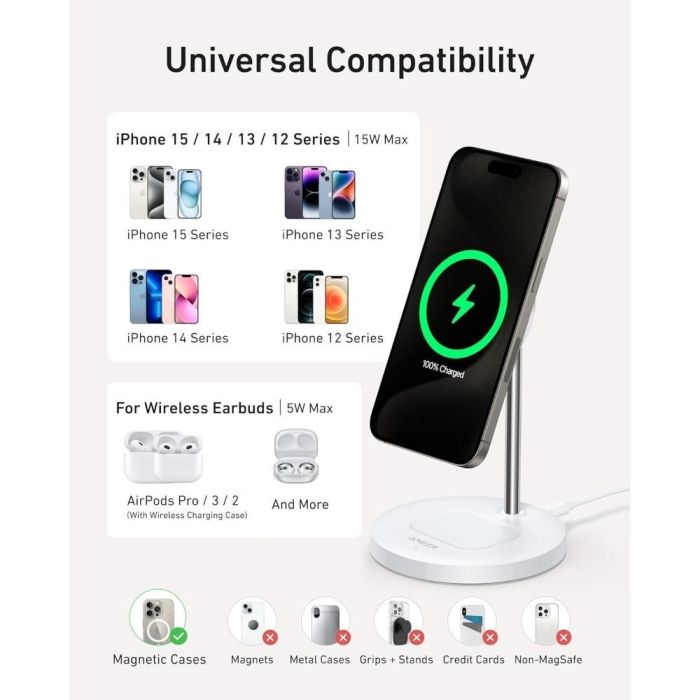- شاحن MagSafe لاسلكي 2 في 1 بقوة 15 واط للهاتف والسماعة الذكية من Anker