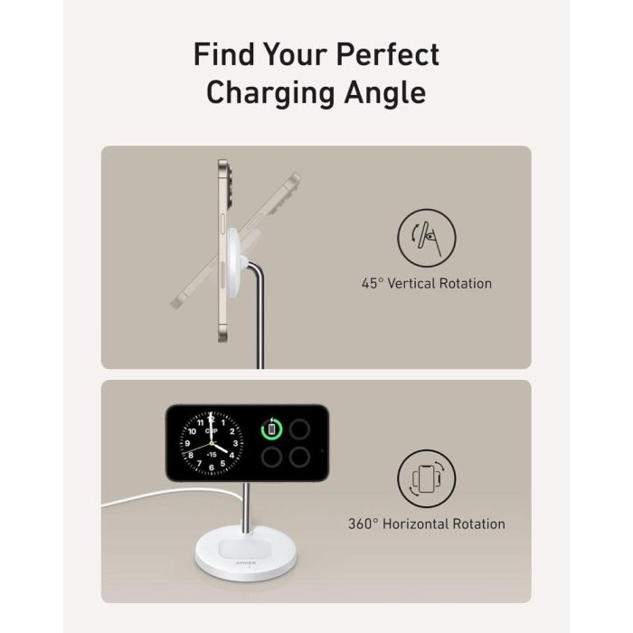 حل شحن متكامل يمنحك كفاءة وأناقة في نفس الوقت، بفضل شاحن أنكر اللاسلكي 2 في 1 بميزة التثبيت المغناطيسي وقوة شحن تصل إلى 15 واط لأجهزة iPhone المتوافقة. تصميم بزاوية عرض قابلة للتعديل لراحة أكبر أثناء الاستخدام، مع إمكانية شحن هاتفك وسماعاتك في وقت واحد، ليمنحك شحن منظم وسريع دون الحاجة لأي كيبلات إضافية