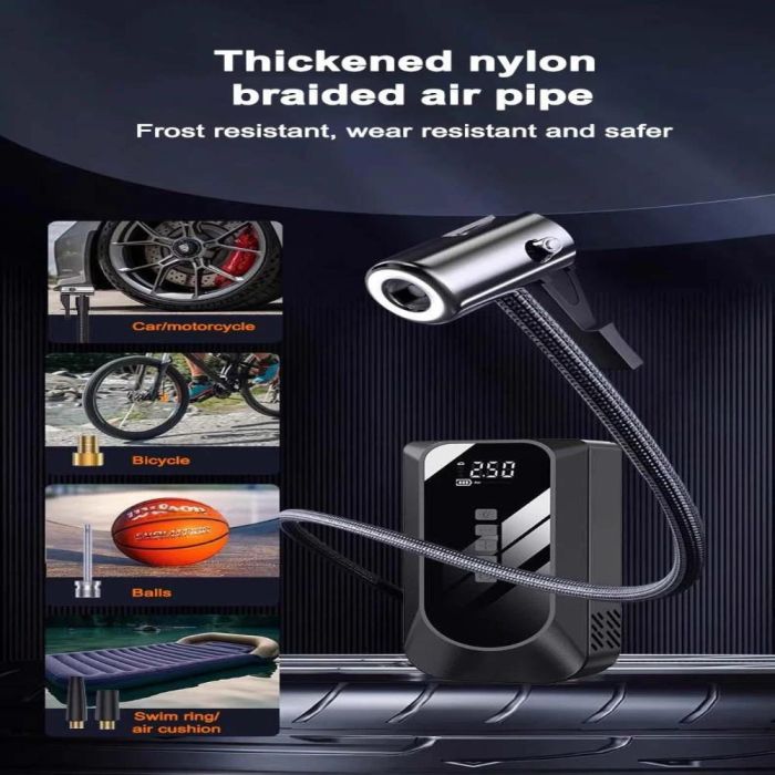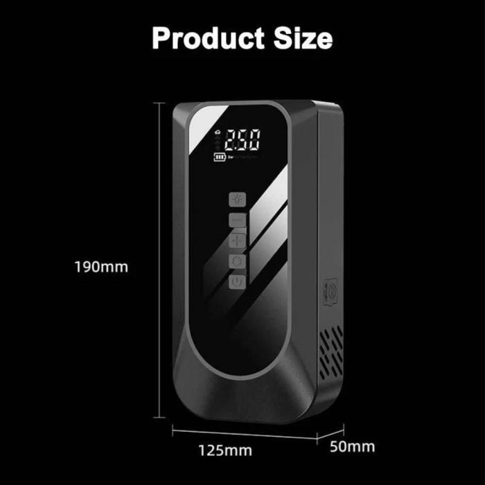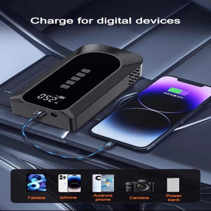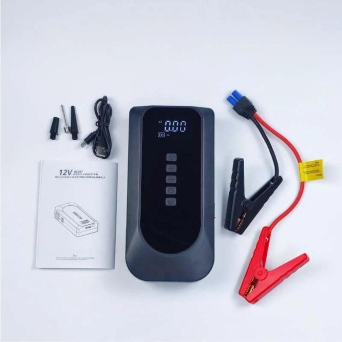 - 4 وظائف في جهاز واحد: تشغيل السيارة، مضخة هواء، شحن الهواتف، وإضاءة طوارئ LED