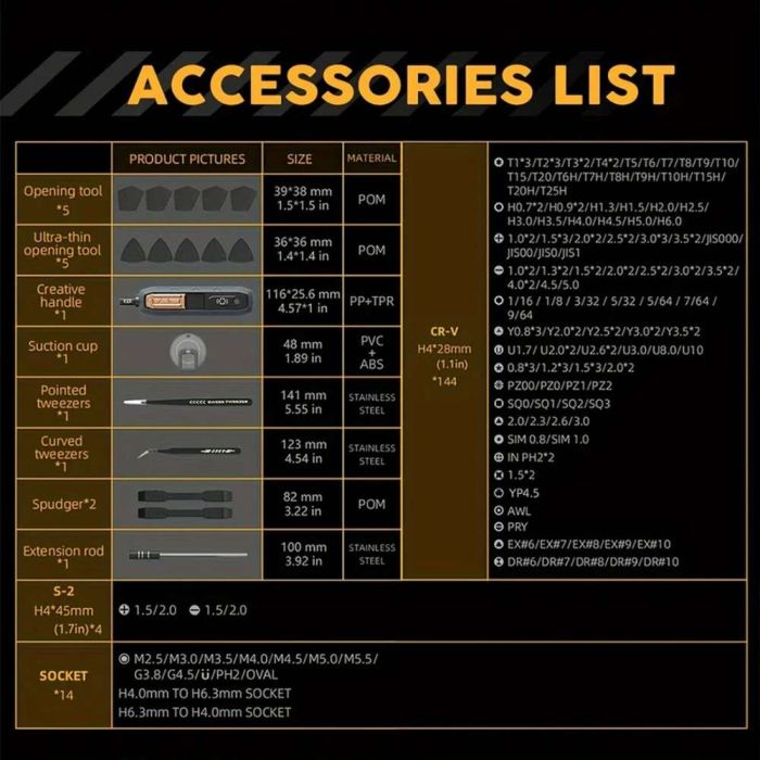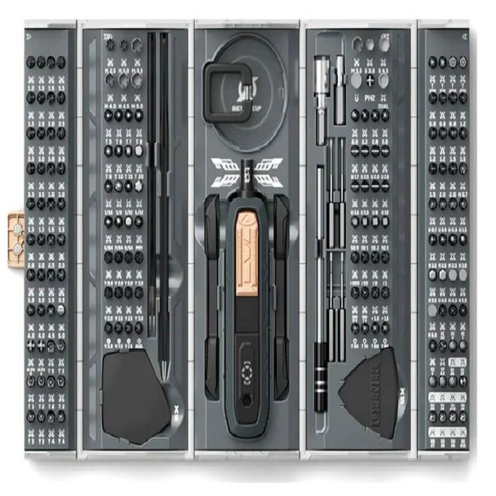 طقم أدوات احترافية لإصلاح الأجهزة الإلكترونية. يتميز بمجموعة واسعة من لقم مفك البراغي، والخصائص المغناطيسية، وصلة قابلة للتمديد. مثالي لصيانة أجهزة اللابتوب والهواتف، أجهزة الألعاب، الساعات والنظارات، إضافة إلى الأعمال اليدوية متوسطة الحجم، مثل تجميع الأثاث، تركيب الرفوف المعلقة، الصور أو الستائر. مزود بمقبض ناعم لقبضة محكمة، أنواع رؤوس متعددة، كما أنه مقاوم للصدأ مما يجعله سهل الاستخدام لجميع الأعمال اليدوية في جميع أنحاء المنزل