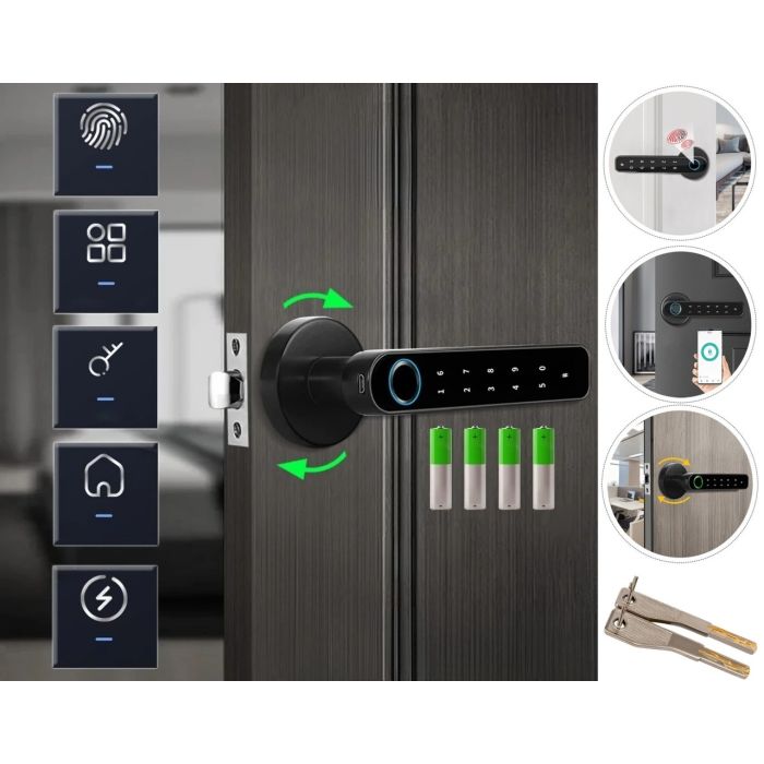 عزز أمان منزلك باستخدامك قفل الباب الذكي متعدد الاستخدامات، يتميز هذا القفل بمجموعة متنوعة من طرق الفتح، بما في ذلك التعرف على بصمات الأصابع وتخزين ما يصل إلى 50 بصمة، إدخال رمز المرور وتطبيق الهاتف الذكي Tuya Smart بالإضافة إلى مفتاحين للاستخدام في حالات الطوارئ