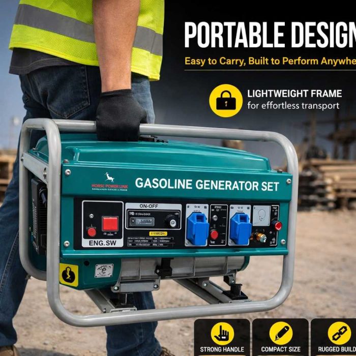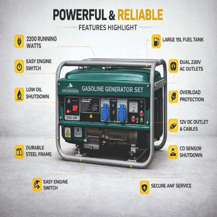 يتميز مولد الكهرباء بنظام تشغيل يدوي سريع الاستجابة، كما يعمل بجهد 230 فولت مع منافذ متعددة، ومزود بموتور بقوة 7 حصان يضمن أداء مستقر تحت الأحمال الثقيلة وكفاءة عالية في استهلاك الوقود. تصميمه المدمج والمحمول يجعله مناسبًا لحالات الطوارئ والأماكن الخارجية ومواقع العمل
