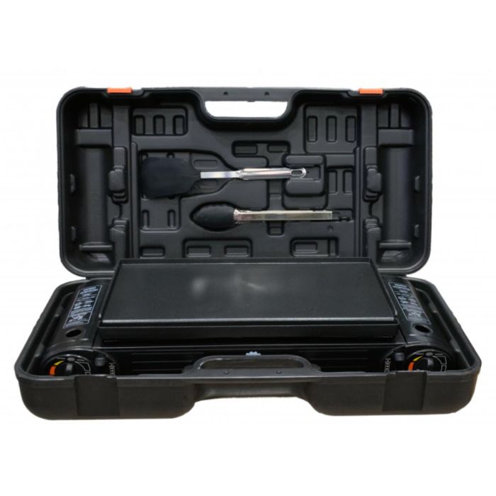موقد غاز محمول بشعلتين يوفر قوة طهي عالية، تصميم عملي مع أرجل ثابتة، مناسب للرحلات والتخييم والاستخدام الخارجي.