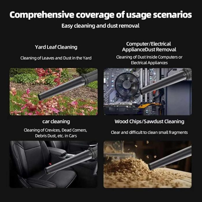 يجمع هذا الجهاز بين وظيفتي نفخ الهواء والشفط، مكنسة تنظيف قوية للسيارة والمنزل والمكتب، كما يعمل كمنفاخ هواء لإزالة الغبار أو نفخ أوراق الأشجار، ومزود ببطارية قابلة للشحن تدوم حتى ساعة واحدة