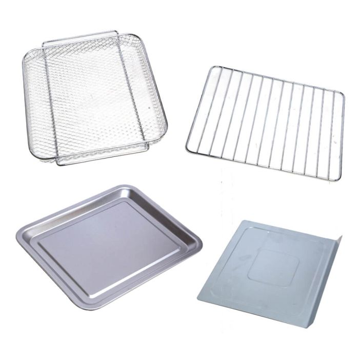 - الملحقات الأساسية المتضمنة: رف سلكي، سلة شبكية، صينية خبز، وصينية فتات الخبز لتنوع أكبر في الاستخدام