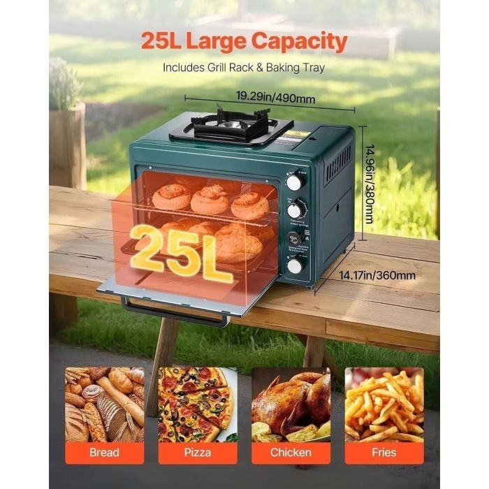 يمنحك هذا الجهاز المحمول المبتكر حرية الطهي والخبز والتحميص في أي مكان، حيث يجمع فرن بحجم كبير بسعة 25 لتر وموقد قوي في وحدة واحدة. بفضل نظام الإشعال الذاتي السريع ودعم عبوات الغاز المزدوجة من البوتان والبروبان، يمكنك الطهي بثقة لفترات طويلة، بينما تضمن ميزات الأمان المتقدمة تجربة طهي مريحة وموثوقة سواء كنت في التخييم أو الرحلات الطويلة.