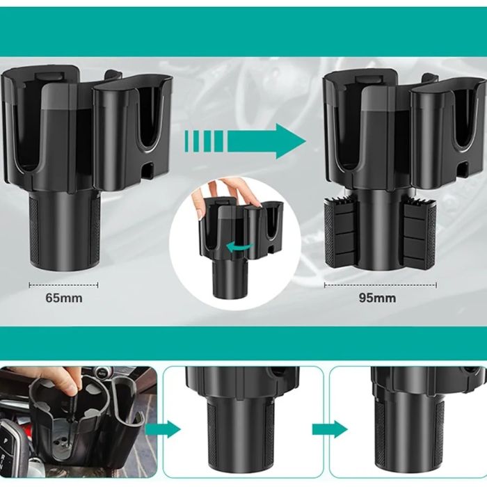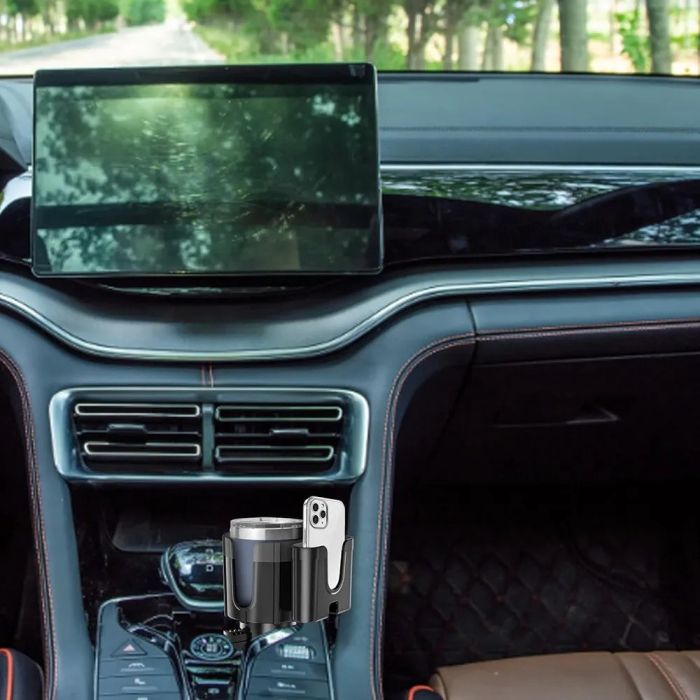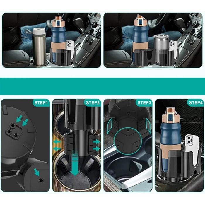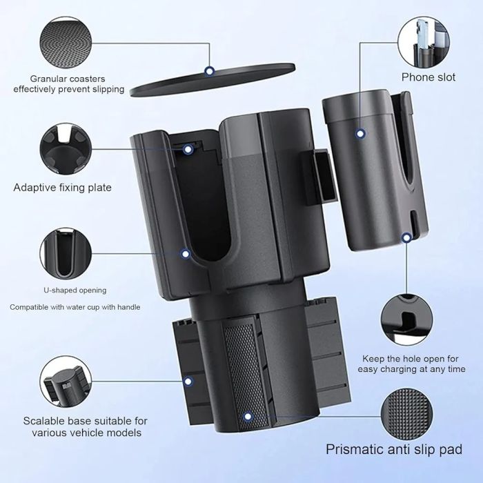 حافظ على مشروباتك وهاتفك بأمان أثناء القيادة مع قاعدة أكواب وقاعدة هاتف 2 في 1 القابلة للتوسيع، سهلة الاستخدام ومناسبة لجميع السيارات.