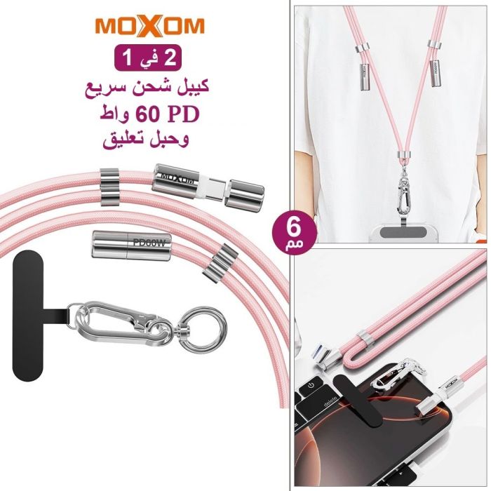كيبل Moxom يغير قواعد اللعبة حيث يمكنك استخدامه للشحن السريع وحبل تعليق للهاتف لسهولة التنقل، يدعم الشحن السريع PD بقوة 60 واط ونقل البيانات بكفاءة، فهو مثالي للهواتف الذكية والتابلت وحتى أجهزة اللابتوب، كما يضمن تصميمه المتين سماكة 6 مم أداءً يدوم طويلًا، بينما يجعل تصميم حبل التعليق المقاوم للضياع اكسسوار عملي للاستخدام اليومي. سواء كنت مسافرًا أو أثناء التنقل أو في العمل، يضمن هذا الكيبل الوصول السريع والطاقة المستقرة لشحن الأجهزة والتعليق دون استخدام اليدين في آن واحد