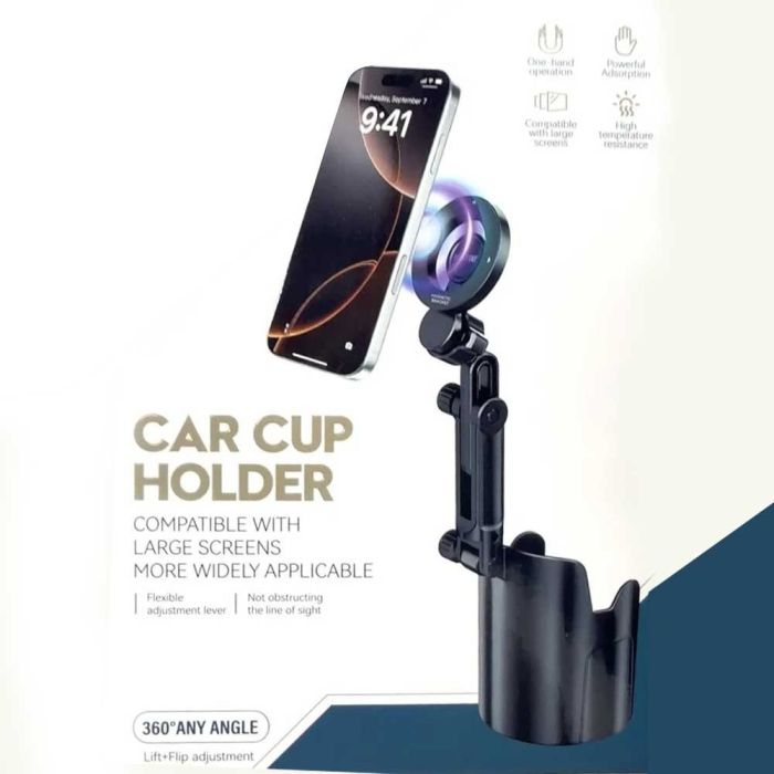 تصميم ذكي يجمع بين ستاند للهاتف وقاعدة أكواب، حيث توفر تثبيت مغناطيسي قوي يدعم هواتف MagSafe، كما تتميز بإمكانية الدوران 360 درجة وذراع مفصلي قابل للتعديل لوضعية مثالية