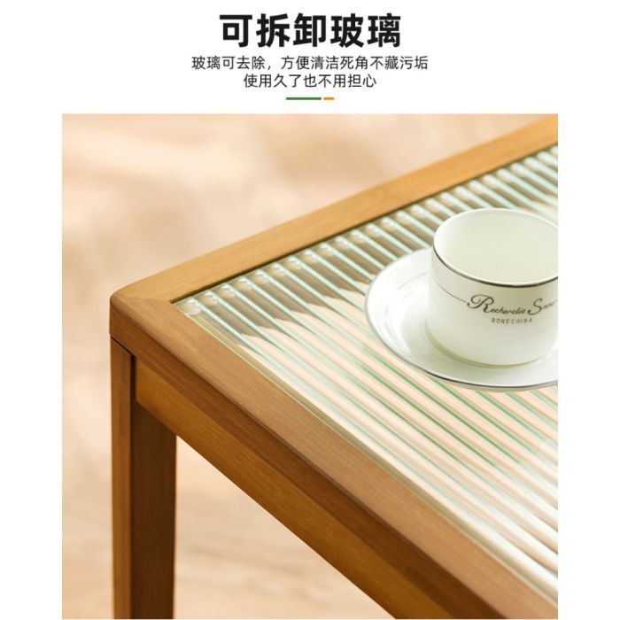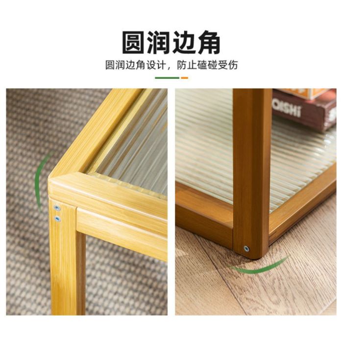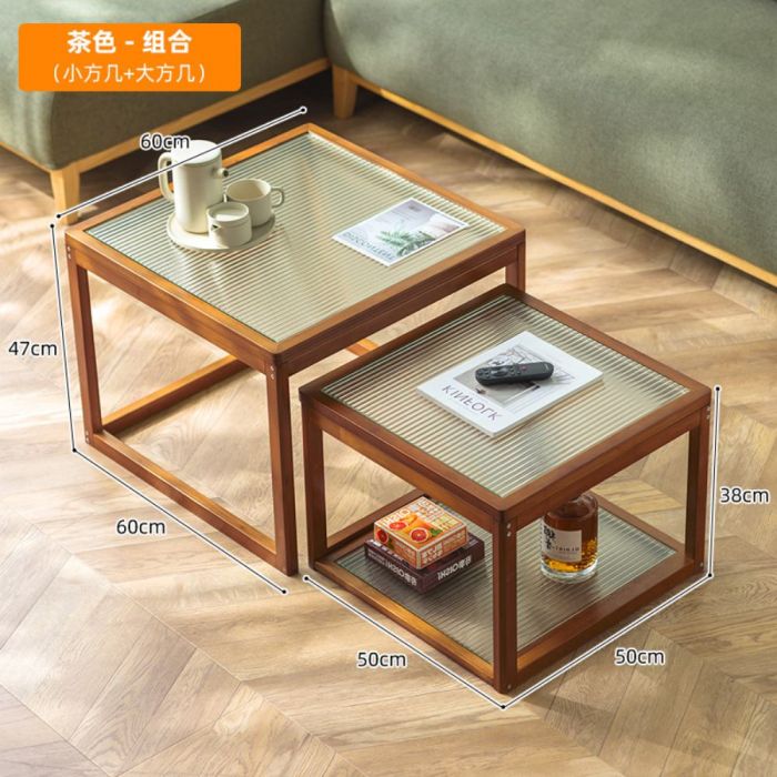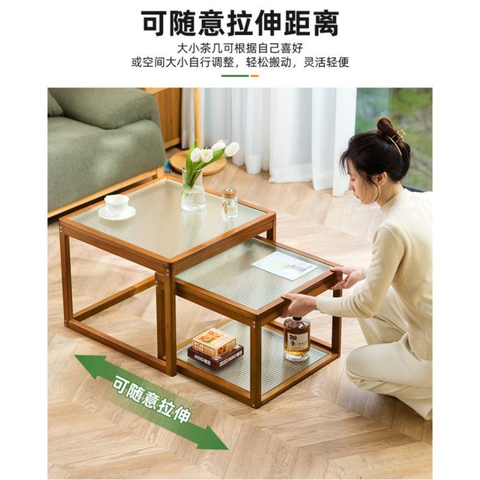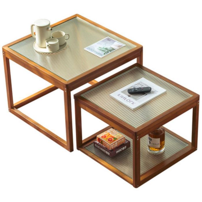 طقم 2 طاولة بتصميم متداخل بسطح زجاجي وإطار خشب بامبو مصنوع من زجاج مخطط أنيق، يمنح شفافية عصرية ومقاومة جيدة للخدش والحرارة، إطار بامبو متين يوفر ثباتاً طبيعياً ولمسة دافئة للمساحة