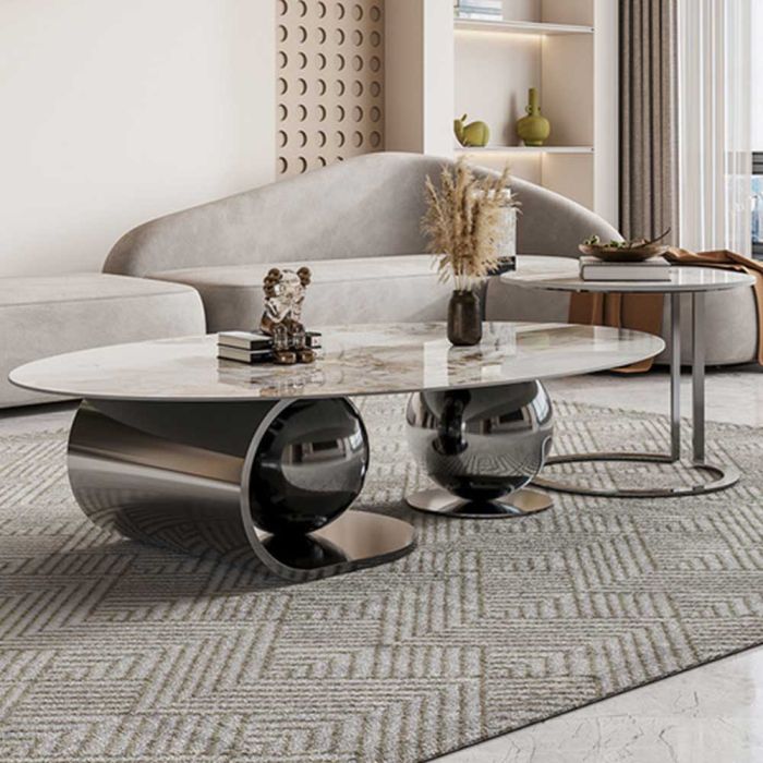 - طقم 2 طاولة جانبية مع سطح حجري وقاعدة فولاذية