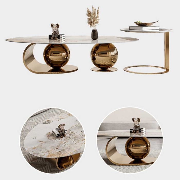 طقم 2 طاولة جانبية مع سطح حجري وقاعدة فولاذية