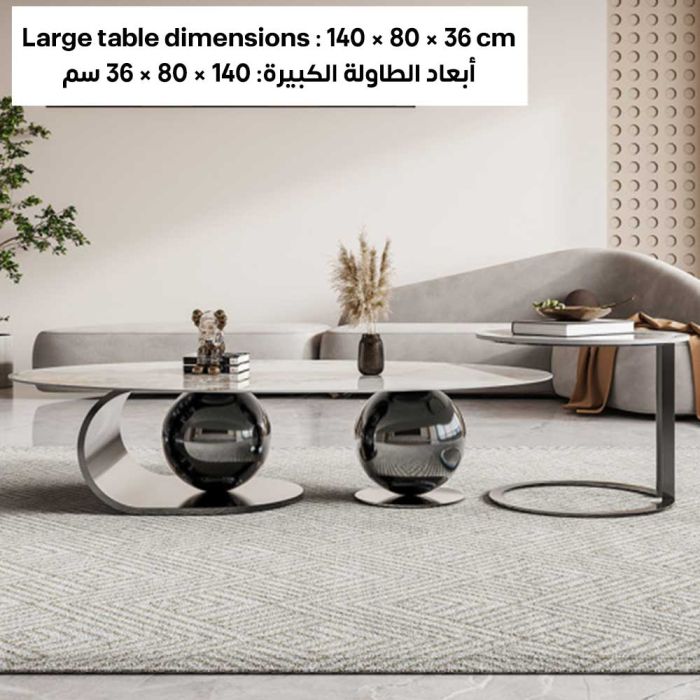 طقم 2 طاولة جانبية مصنوع من سطح رخامي أنيق، وهيكل فولاذي ثابت، يمنح تنسيقًا راقيًا لمساحتك، مثالي لتقديم الضيافة والديكور، سهل التنظيف، ويضيف لمعة فاخرة دون مبالغة