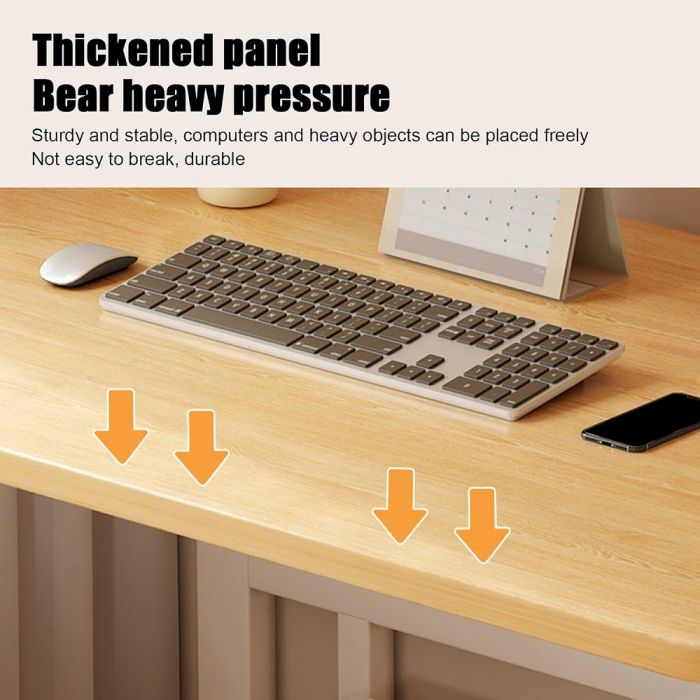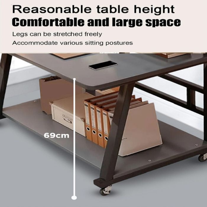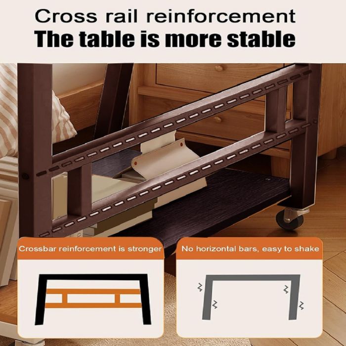 مكتب خشبي متحرك بتصميم مبتكر مع طبقتين مدمجتين ورف مخصص الشاشة، مما يوفر تجربة عمل احترافية تجمع بين الأناقة والأداء العملي، حيث تتيح الطبقة الوسطى وضع الأدوات الصغيرة مثل اللابتوب، الماوس ولوحة المفاتيح بشكل مرتب، بينما توفر الطبقة السفلية مساحة مثالية للأجهزة الكبيرة مثل الكمبيوتر والطابعة أو حتى الكتب، مزود بقضبان فولاذية متقاطعة في الجزء الخلفي من المكتب، ولوحة سميكة تتحمل الضغط الثقيل، ووسائد قدم بالإضافة إلى عجلات قابلة للتعديل حتى تتمكن من نقل المكتب بسهولة عبر مناطق مختلفة بمرونة