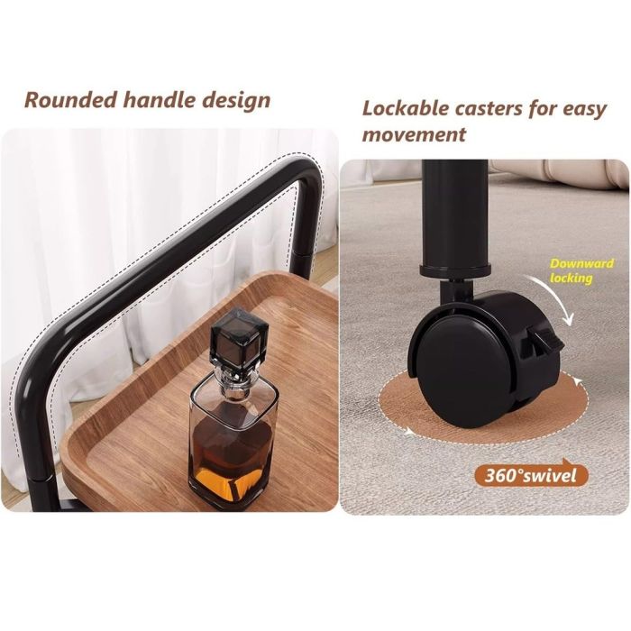طاولة جانبية خشبية بطبقتين توفر مرونة فائقة في الاستخدام بفضل تصميمها المزود بعجلات انسيابية. السطح القابل للإزالة يجعلها مثالية لتقديم المشروبات أو كمنظم للأدوات في غرف المعيشة، مع هيكل معدني يضمن الثبات، مما يجعلها قطعة أثاث عملية تجمع بين البساطة والجمال في التنظيم.