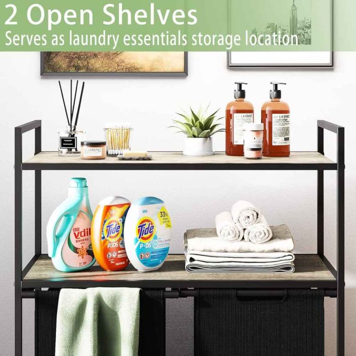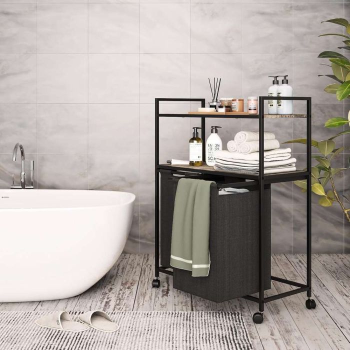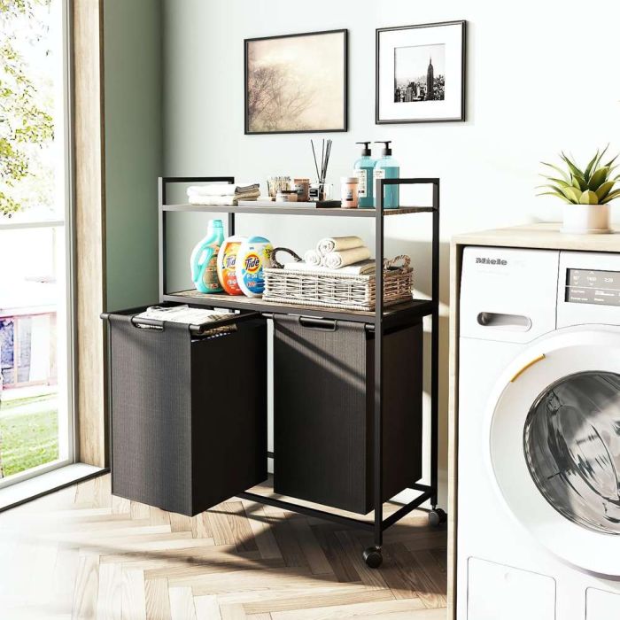 - منظم تروللي 2 رف مع سلة غسيل مزدوجة