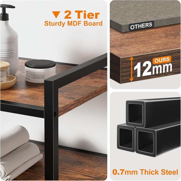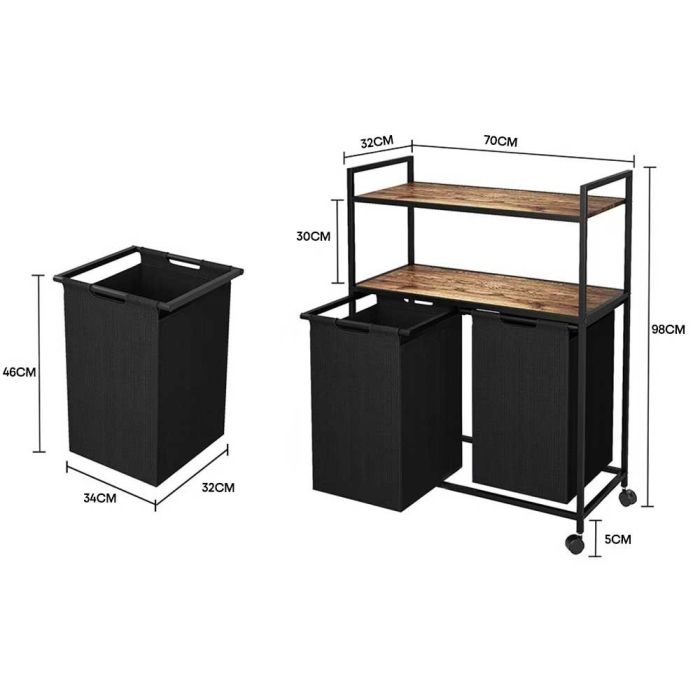 يوفر التروللي حلاً عملياً لتنظيم الغسيل بفضل تصميمها ذو المقصورات المزدوجة لفصل الملابس، مما يضمن لك الراحة والتنظيم في مكان واحد، مزود بأرفف علوية لتخزين مستلزمات الغسيل أو طي الملابس بسهولة. ومصنوع من إطار معدني متين ولوح خشبي علوي لمظهر أنيق مع قوة التحمل على المدى الطويل. بينما تحافظ سلات الغسيل المصنوعة من قماش أكسفورد المقاوم للماء على الملابس جافة ونظيفة. بالإضافة إلى ذلك، فهي سهلة التجميع وموفرة للمساحة، مما يجعلها مثالية لغرف الغسيل والحمامات