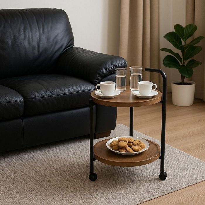 قم بتطوير مساحة معيشتك مع هذه الطاولة الجانبية الدائرية من طبقتين، مصممة بسطح مقاوم للماء ورفوف عملية. تأتي بإطار معدني متين ولمسة نهائية خشبية أنيقة، مما يجمع بين الجمال والمتانة. يمكن استخدام الرف العلوي لوضع القهوة، الكتب، الصور، المصابيح أو الريموت، بينما يوفّر الرف السفلي مساحة لوضع المجلات، الوجبات الخفيفة، والصناديق