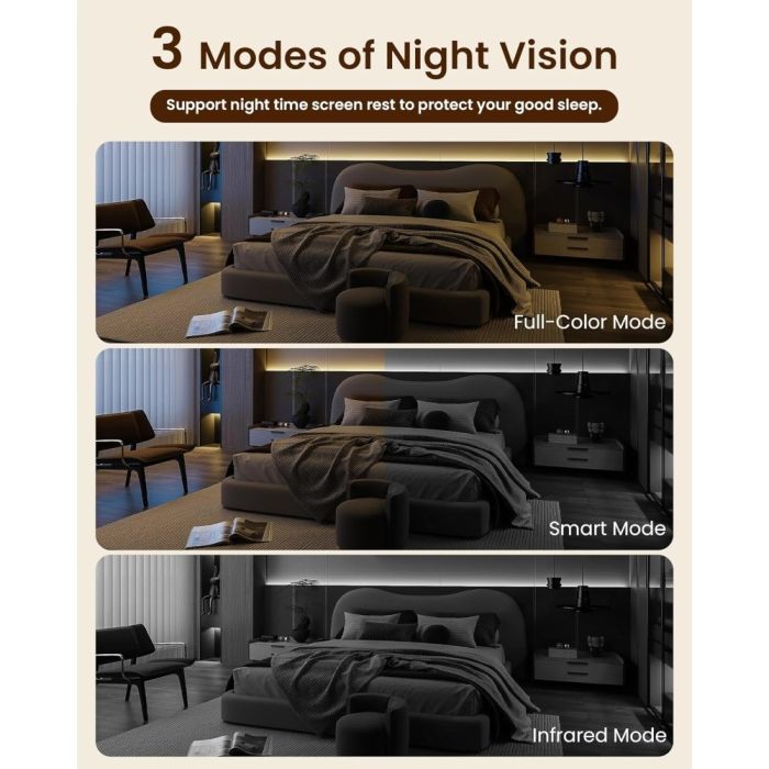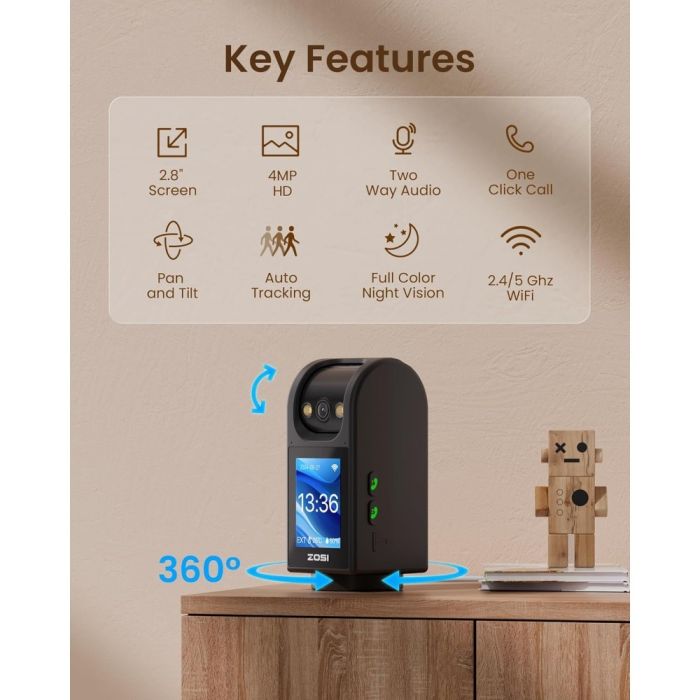 استمتع بحماية ذكية واتصال مباشر مع كاميرا ZOSI بدقة 4 ميجابكسل وشاشة 2.8 بوصة، المصممة لتمنحك راحة البال في كل لحظة. بفضل الصوت ثنائي الاتجاه وإمكانية مكالمات الفيديو بضغطة زر أو إيماءة اليد، يمكنك التواصل مع أحبائك بسهولة من أي مكان. الكاميرا تدعم التتبع التلقائي للحركة، وتوفر رؤية ليلية ملونة، مع تغطية 360 درجة للغرفة. اتصال واي فاي مزدوج 2.4/5GHz يضمن أداء مستقر وسريع، لتجربة مراقبة متكاملة وذكية في كل وقت