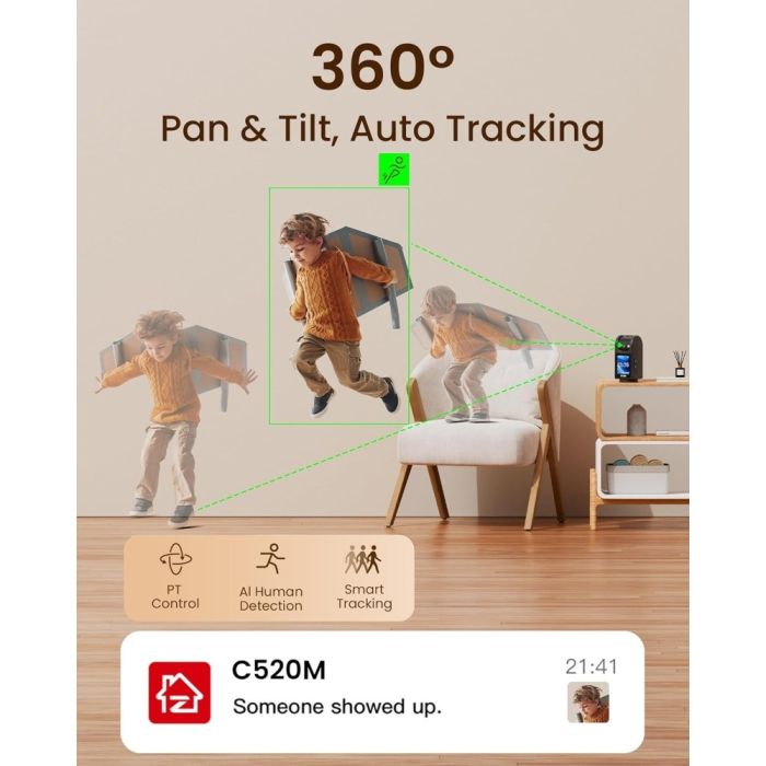 - تتبع تلقائي للحركة: الكاميرا تتابع الأشخاص تلقائياً داخل الغرفة