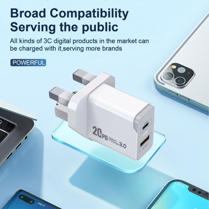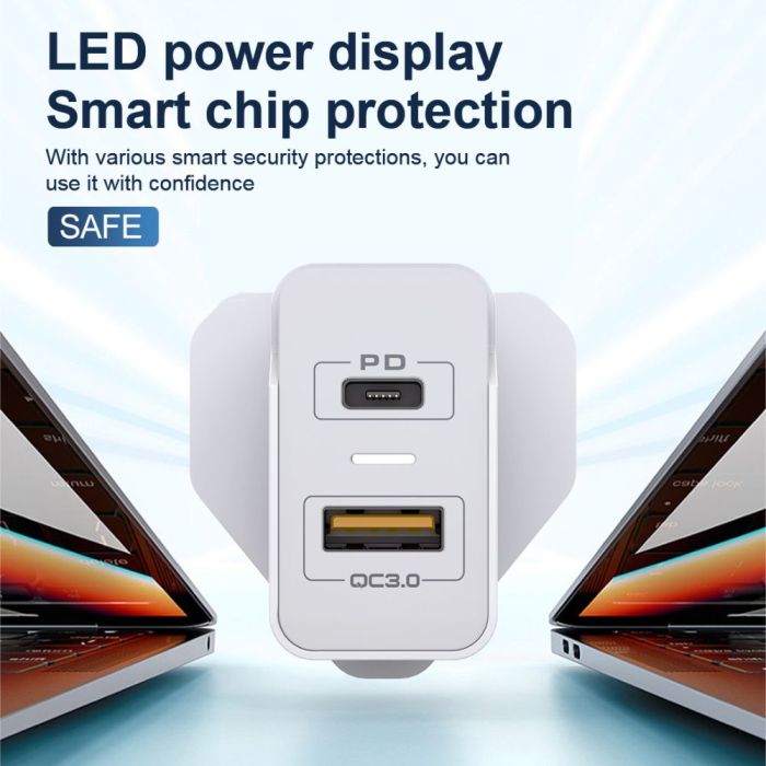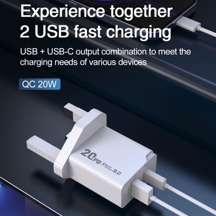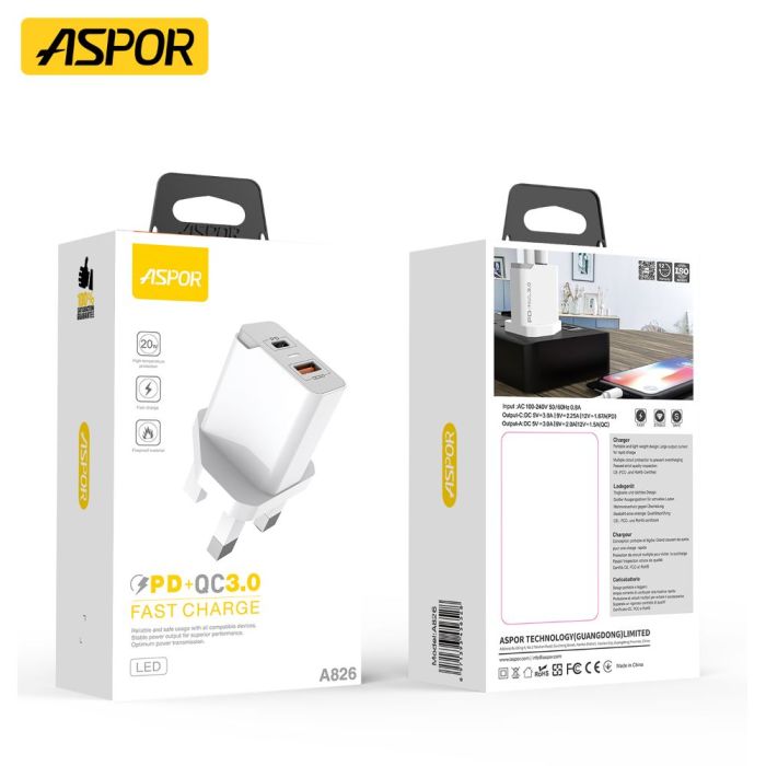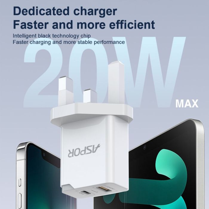 شاحن سريع ثنائي المنافذ بقوة 20 واط من Aspor مصنوع من خامات عالية الجودة، يوفر شحن سريع ومستقر بتقنية PD وQC3.0، تصميم أنيق وخفيف مناسب للاستخدام اليومي، مزود بأنظمة حماية ذكية للحفاظ على أجهزتك