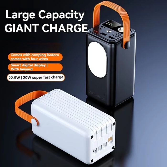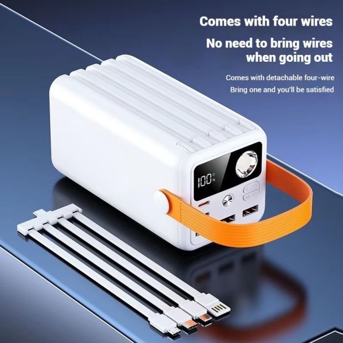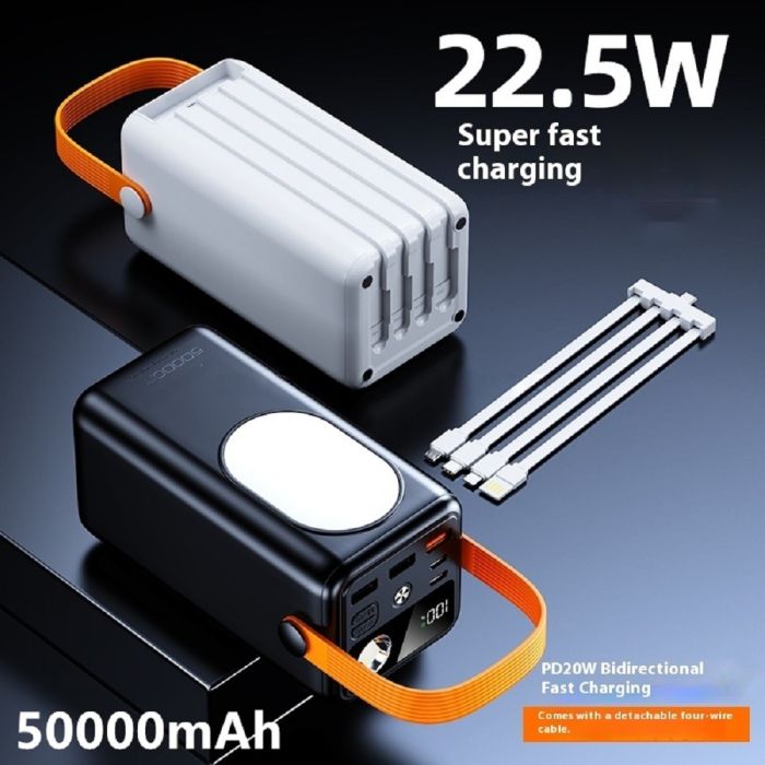 طاقة تدوم طويلاً يمكنك الحصول عليها مع هذه البطارية الاحتياطية، تتميز بسعة هائلة 50000 مل أمبير، مجهزة بـ 3 منافذ USB-A بقوة 22.5 واط و2 منفذ USB-C PD بقوة 20 واط، مع 4 كيبلات مدمجة لتناسب مختلف الأجهزة