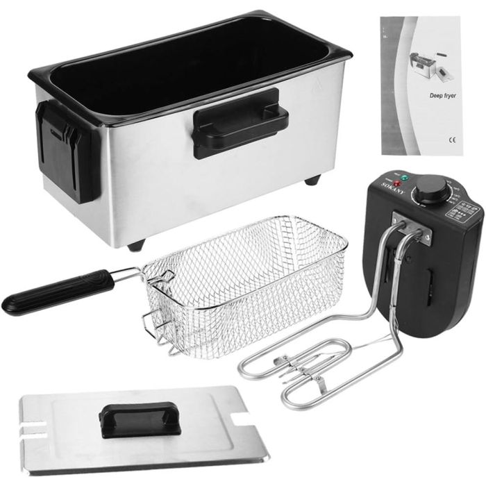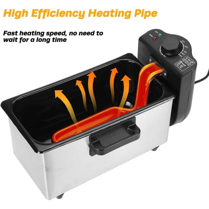 قلاية عميقة ذات طراز احترافي مزودة بسلة كبيرة الحجم وسعة زيت يمكنها قلي دفعات كبيرة الحجم من الأطعمة، رائعة لقلي الخضروات والمأكولات البحرية والسمبوسة والدجاج، تم تصميمها مع شمعة تسخين موجود في الوعاء، مما يجعلها ملائمة للاستخدام في أي وقت، وتحتوي على وعاء زيت وغطاء آمن للغسل في غسالة الصحون مع تصميم آمن لتخزين سلك الطاقة، بينما يمكن طي سلة القلي السلكية مع المقبض لسهولة التخزين