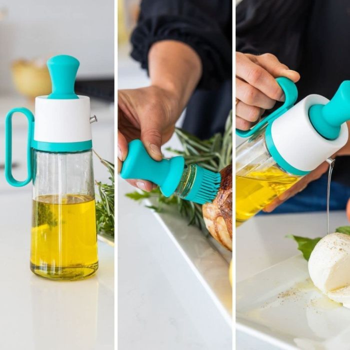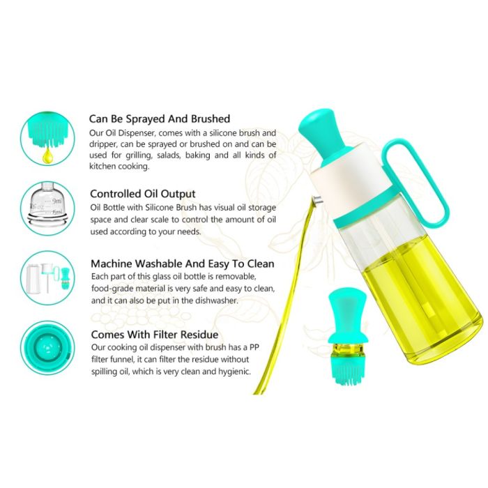 زجاجة توزيع زيت 3 في 1 مزودة بفرشاة سيليكون مدمجة، تساعدك على توزيع الزيت بدقة وسهولة، مع تصميم عملي يتيح لك التحكم في الكمية أثناء الطهي أو الشوي أو تحضير السلطات، لاستخدام نظيف ومريح يوميًا.