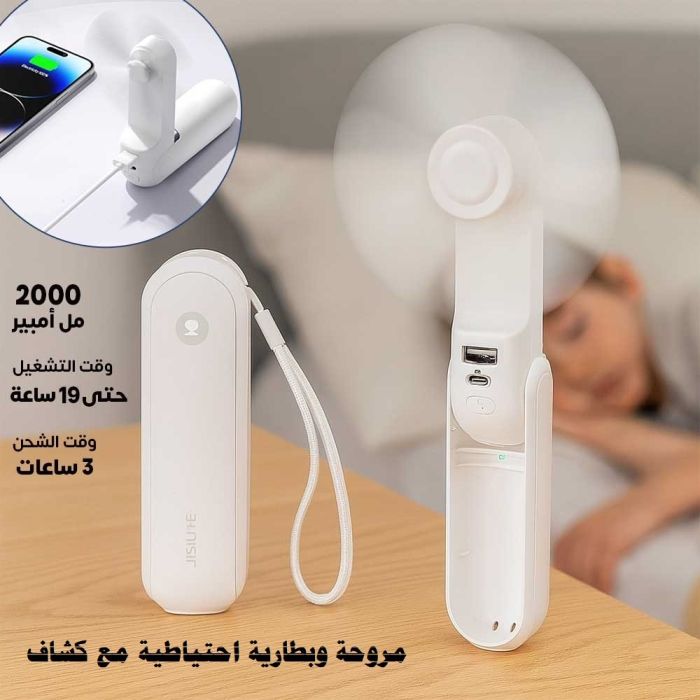 مروحة محمولة خفيفة الوزن وهي رفيقك المثالي لتجاوز حرارة الصيف في نزهاتك الخفيفة، حيث توفر لك هذه المروحة انتعاشًا فوريًا في أي مكان، لتضمن لك راحة شخصية. وحتى في منزلك، يمكن وضعها على المكتب لتوفير تيار هواء منعش وموجه. مزودة ببطارية تدوم حتى 19 ساعة وتشحن بالكامل خلال 3 ساعات، مما يجعلها أداة عملية ومتعددة الاستخدامات لتخفيف حدة الحرارة في أي وقت وأي مكان