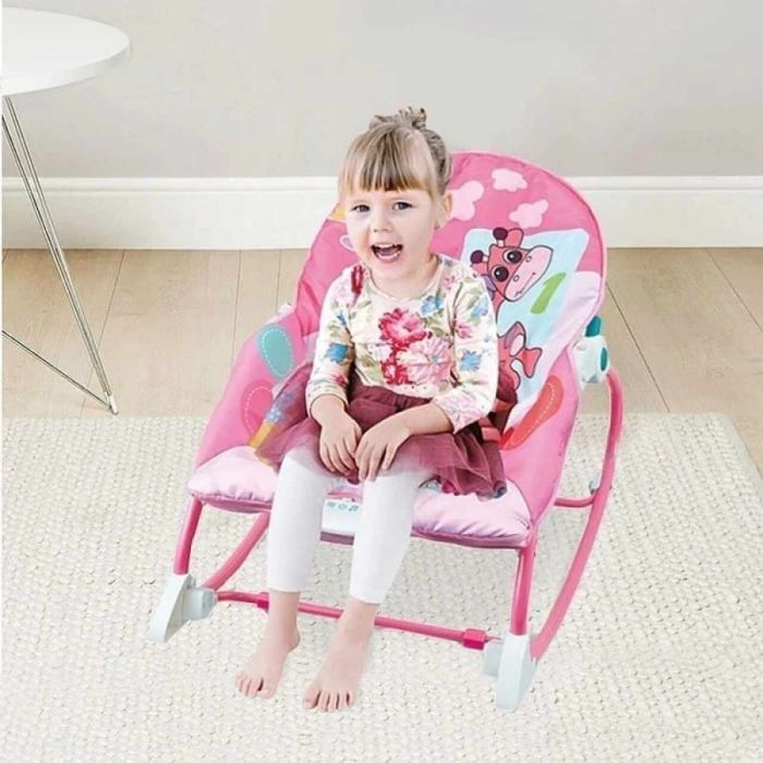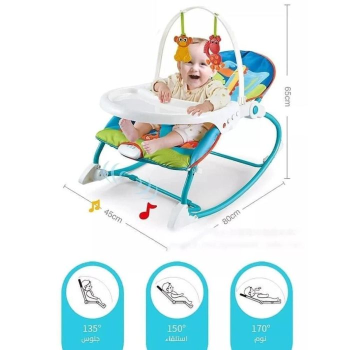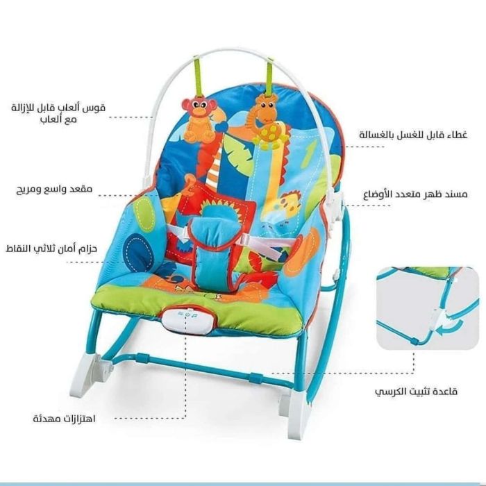 كرسي هزاز للأطفال مع طاولة وقوس ألعاب مصمم ليمنح طفلك الراحة والأمان والمرح في كل لحظة. بفضل أوضاع الميلان المتعددة والاهتزازات المهدئة والألحان المدمجة، يمكن لطفلك الاسترخاء أو النوم أو اللعب بكل سهولة. صينية الطعام الواسعة والقابلة للإزالة وقوس الألعاب يجعل وقت الأكل واللعب أكثر متعة، بينما يضمن القماش الملون والقابل للغسل نظافة وأناقة تدوم. تصميمه المستقر يتيح استخدامه ككرسي ثابت أو كأرجوحة، ليمنح الأهل حرية أكبر وراحة بال.