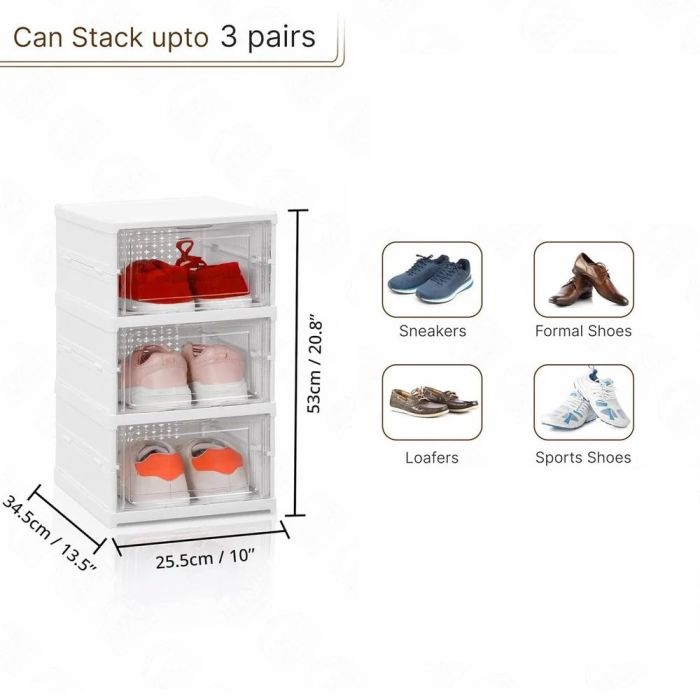 - تصميم قابل للطي بسهولة: يمكن طي وتجميع صندوق الأحذية بسهولة وسرعة، ما يجعله مثاليًا للاستخدام في المنزل والسفر