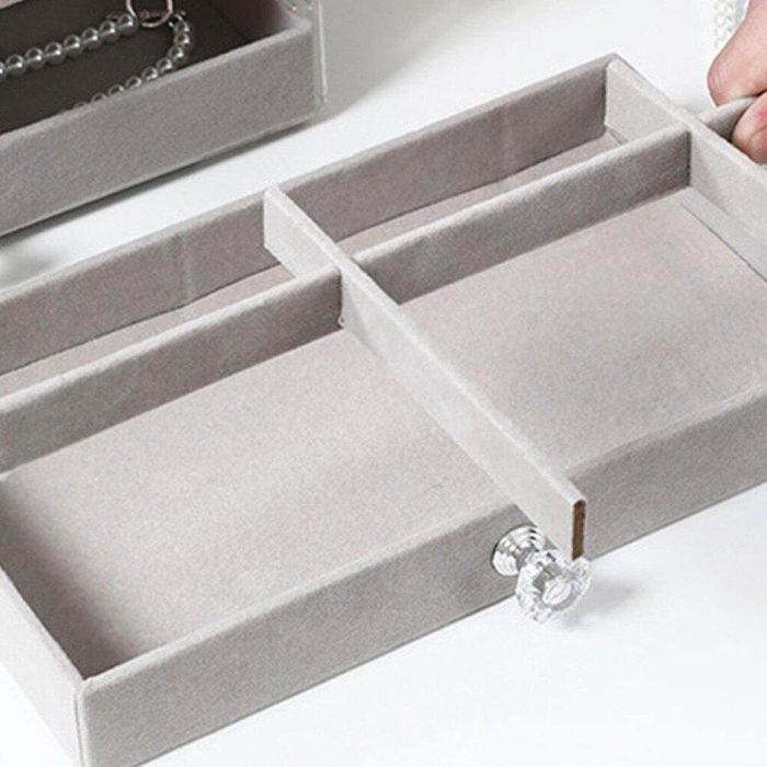 يُعد منظم المجوهرات الأنيق هذا الطريقة المثلى لتخزين وعرض إكسسواراتك الثمينة. مصنوع من لوح مركب متين ومغلف بقماش عالي الجودة، ويوفر بيئة ناعمة وخالية من الخدوش لخواتمك، أقراطك، قلاداتك، وغيرها. يتميز بتصميم ثلاثي الطبقات مع غطاء من الأكريليك الشفاف يتيح سهولة الرؤية والتنظيم.