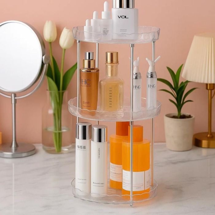 حوّلي فوضى أدوات العناية إلى ركن منظم وأنيق مع هذا المنظم الثلاثي الطبقات. تصميم يجمع بين المتانة والشكل العصري ليجعل وصولك لمنتجاتك المفضلة أسرع وأكثر ترتيباً كل يوم.
