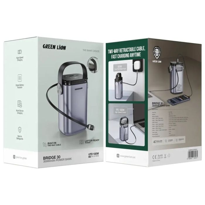 بطارية احتياطية 30000 مل أمبير 100 واط من Green Lion مصنوعة من ABS وPC، تدعم شحن سريع قوي، تتيح شحن عدة أجهزة في نفس الوقت، مزودة بكابل مدمج قابل للسحب، تصميم عملي مع مقبض لسهولة الحمل ومناسبة للاستخدام اليومي والسفر