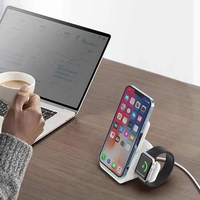 متوافقة مع مختلف الأجهزة، فهو مثالي لأجهزة Apple أو Samsung الخاصة بك. بفضل قوة الشحن السريع التي تصل إلى 15 واط، يمكنك شحن iPhone وApple Watch وAirpods بسرعة في وقت واحد. تأكد من أن جميع أجهزتك جاهزة دائماً