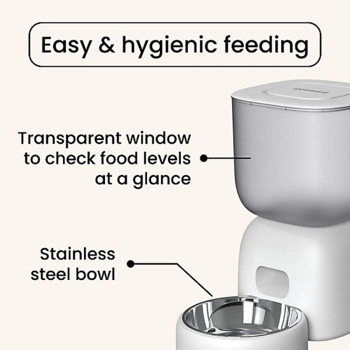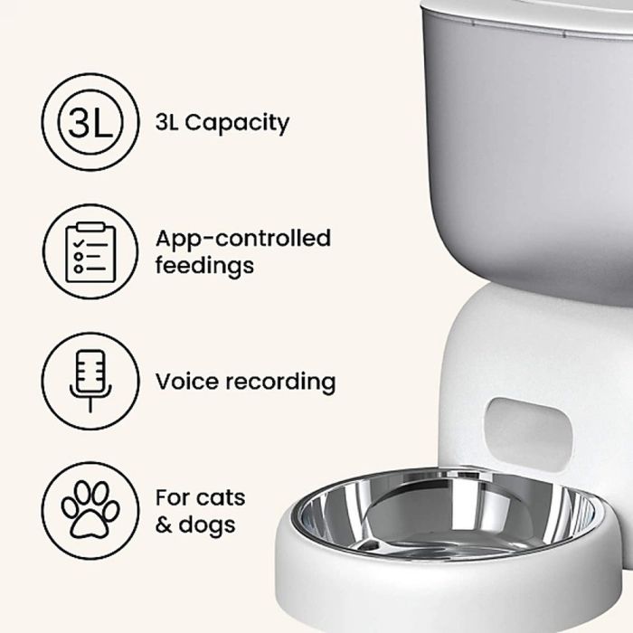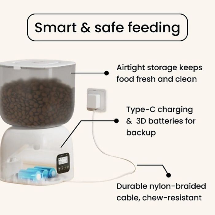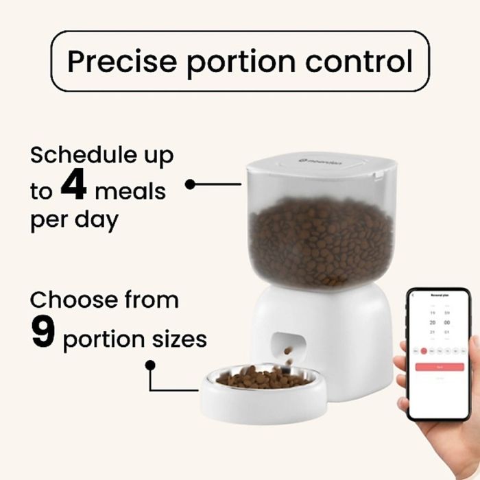 بفضل التحكم الكامل عبر التطبيق، يمكنك تحديد حتى 4 وجبات يومية بـ 9 أحجام مختلفة بدقة متناهية. تضمن خاصية تسجيل الرسائل الصوتية تذكير حيوانك بقدوم وجبته بصوت مألوف. بسعة 3 لتر، يوفر الجهاز تخزيناً محكم الغلق للحفاظ على الطعام طازجاً، كما أن خيارات الطاقة المزدوجة تضمن استمرار التغذية دون انقطاع