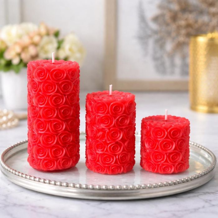 مجموعة من 3 شموع حمراء لنمط زهور تضيف لمسة أنيقة وعصرية للمنزل وتخلق أجواء هادئة ومريحة.