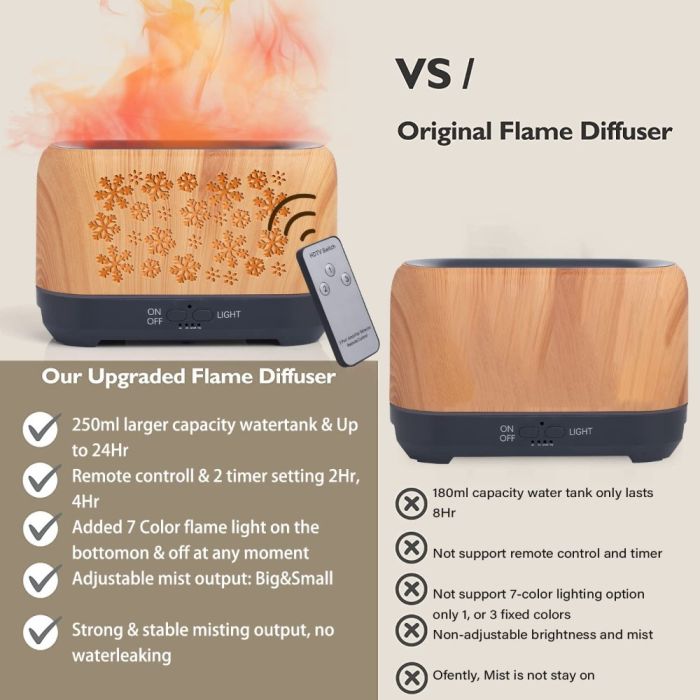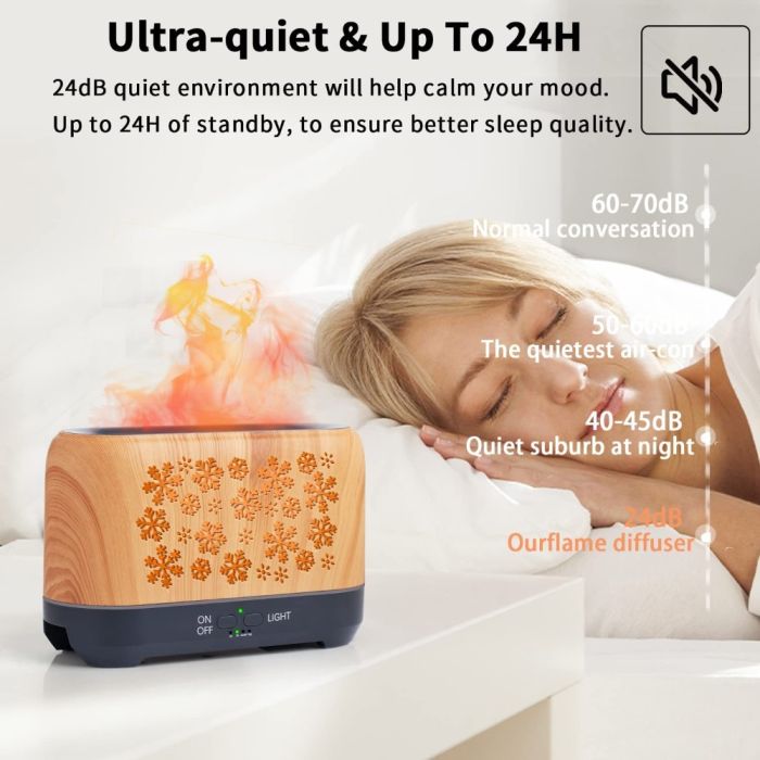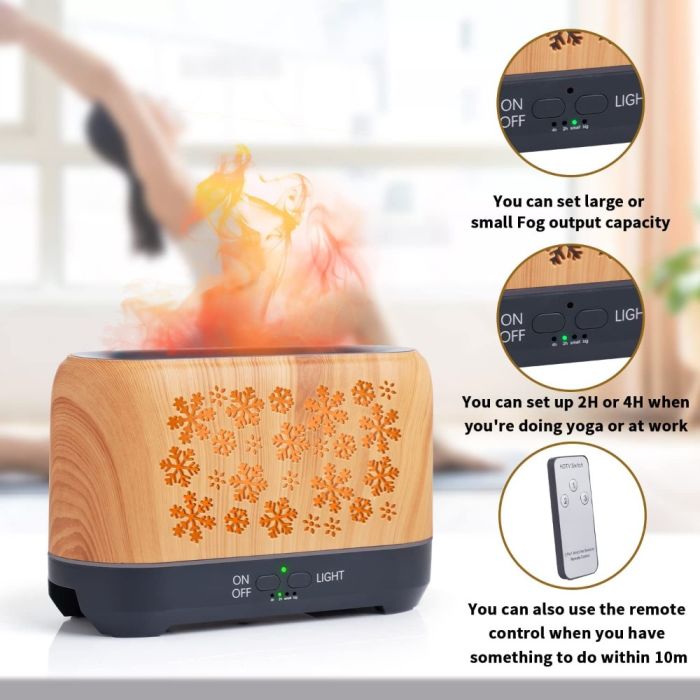 موزع عطر بتأثير لهب 4 في 1 مصنوع من خامات عالية الجودة، يجمع بين التعطير والترطيب مع إضاءة لهب جذابة، يعمل بهدوء فائق مع تحكم عن بعد وتوقيت 2 و4 ساعات، تصميم أنيق يضفي أجواء مريحة في أي مكان