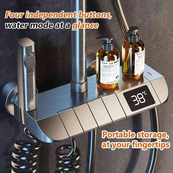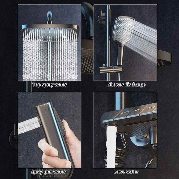 مع خلاط بارد وساخن، رأس دش علوي، رأس دش يدوي مع قاعدة، رشاش يدوي صغير مع قاعدة ومخرج مياه مخفي في الأسفل، جميعها يتم التحكم فيها بأزرار سهلة الاستخدام. سوف تستمتع بتجربة الدش والتدليك في راحة منزلك، مع سهولة التركيب وطرق متعددة لمخرج المياه