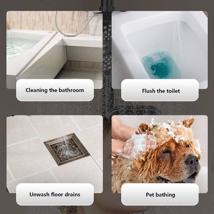 - يحتوي على رأس دش علوي واسع، ورشاش يدوي مع قاعدة، وفتحة مياه مخفية في الأسفل
